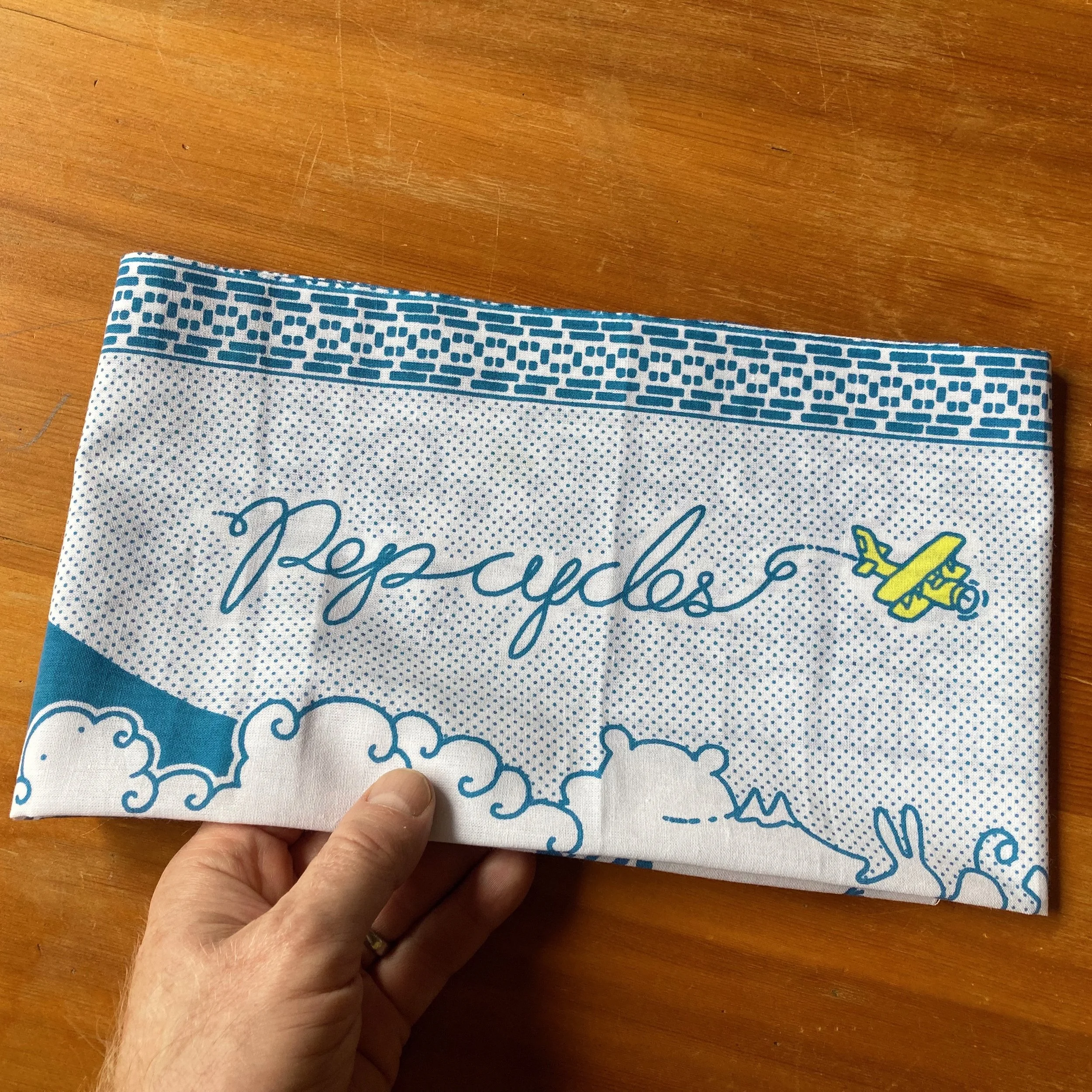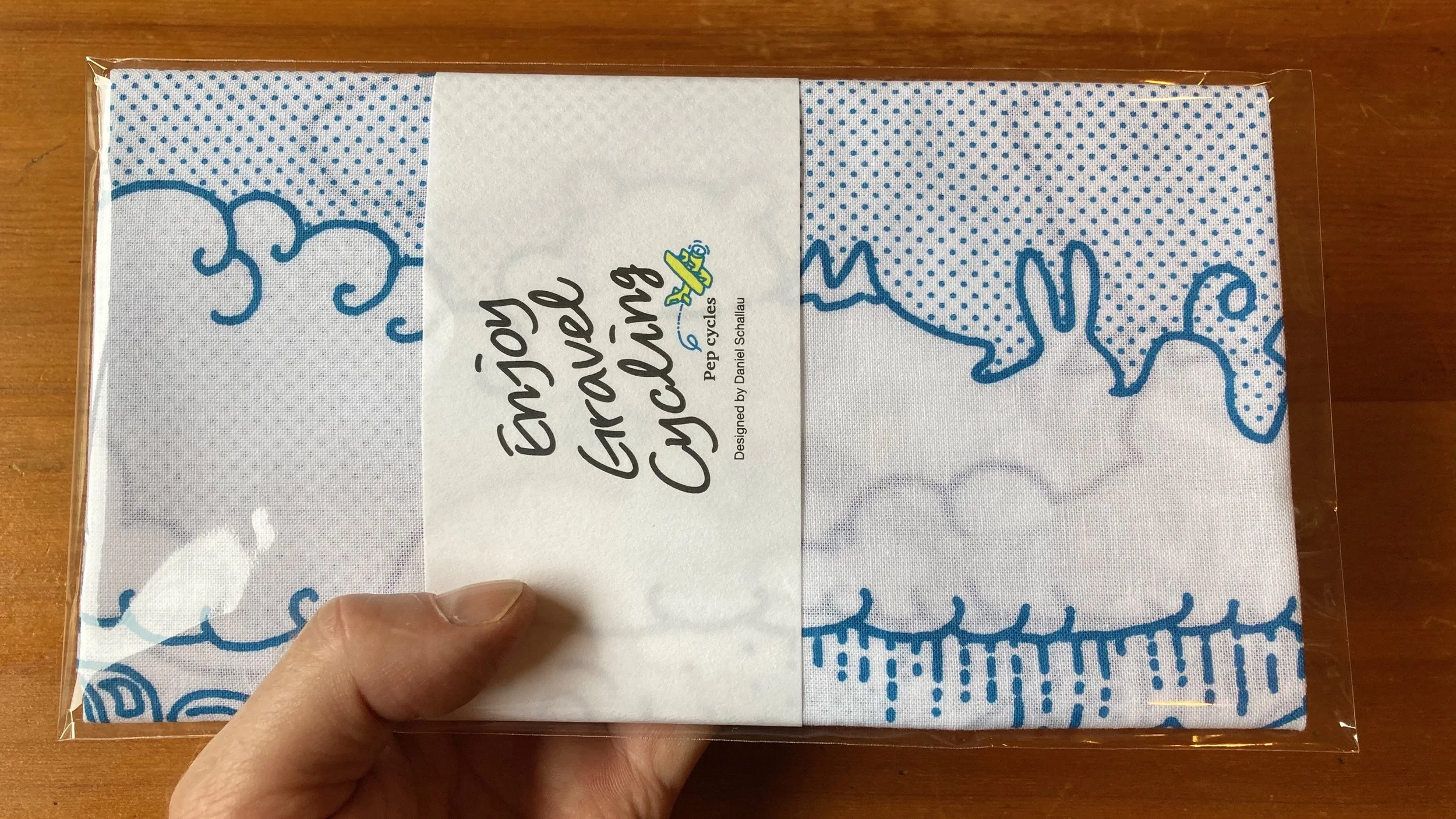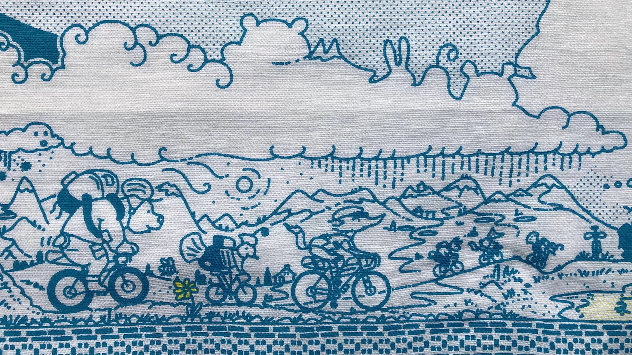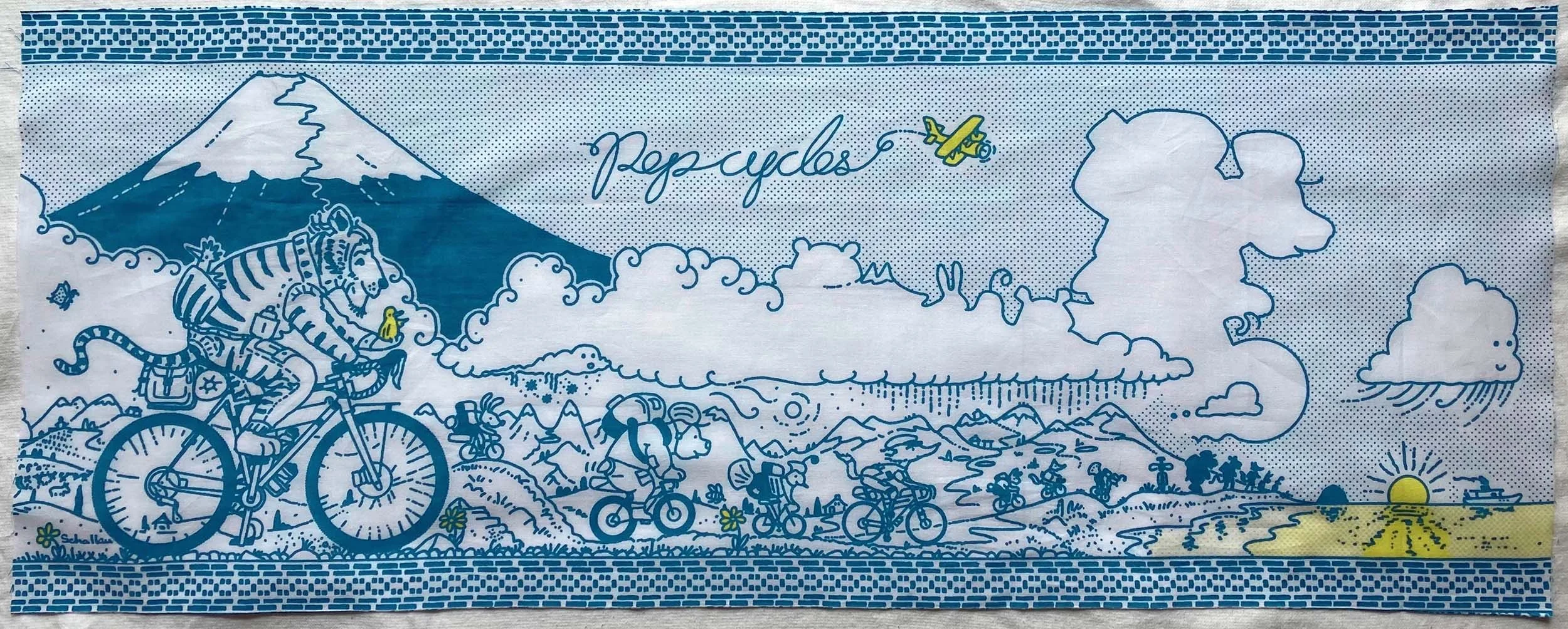 A collaboration with Tokyo bicycle designer Ebine Taku of Pep Cycles on a gravel cycling themed Tenugui. 2022 version.
